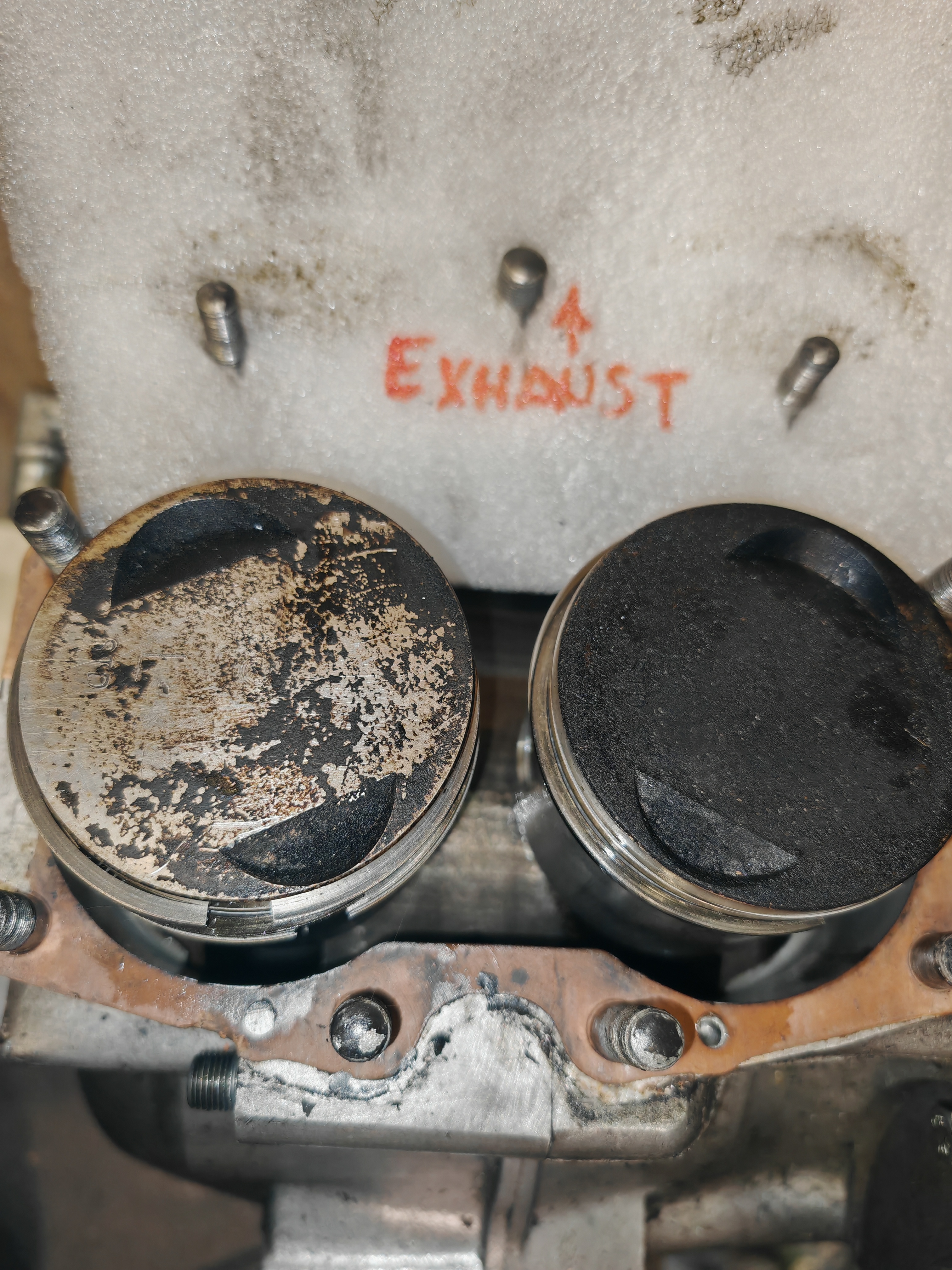 Hello, I'm stripping the engine to clean the sludge trap before sending off the crank etc for a dynamic balance. Can anyone please confirm what I'm thinking, that the pistons are facing the wrong way, the large cut outs are on the exhaust side. The engine has ran well for 1200 miles without signs of anything amiss.