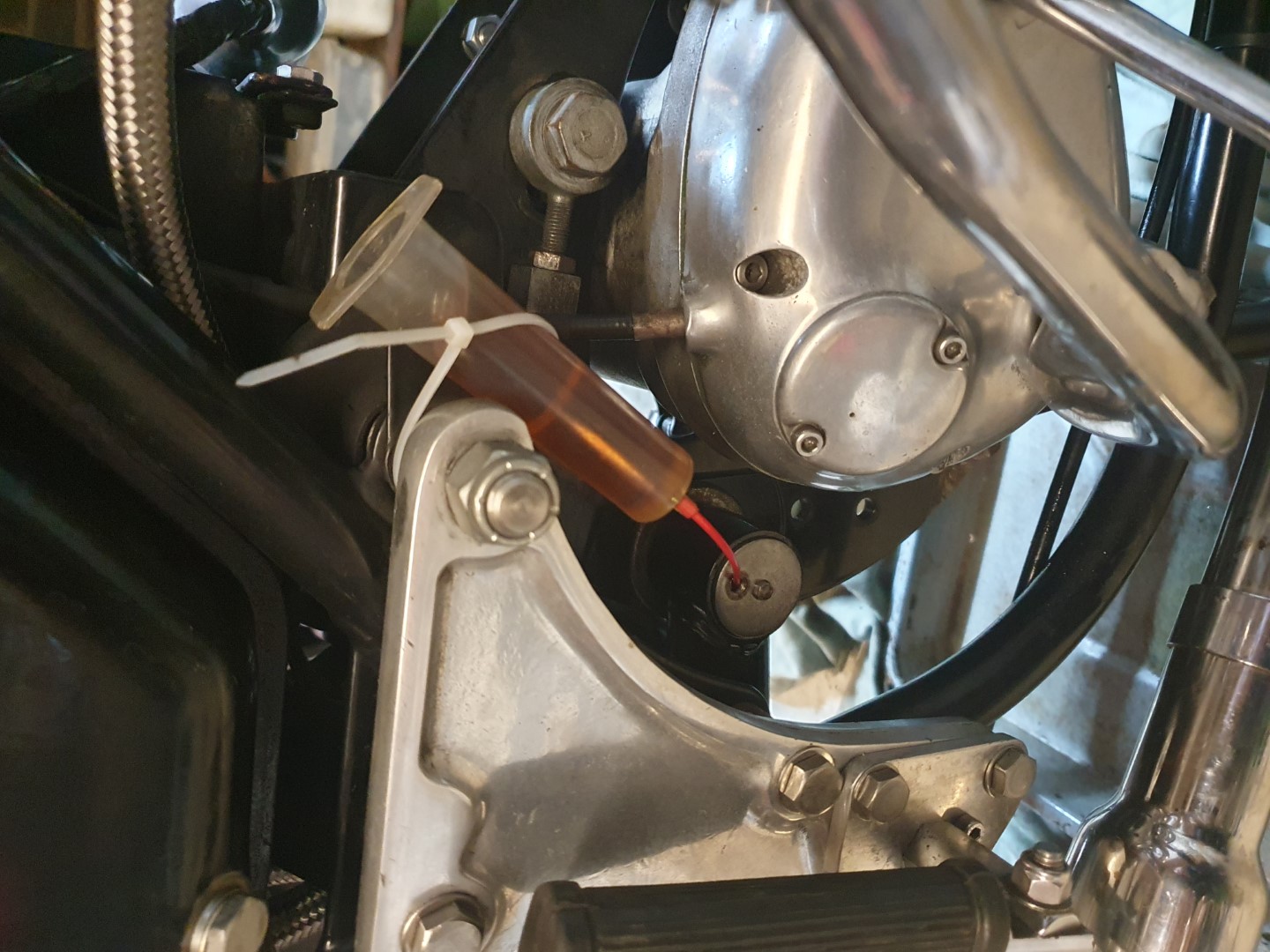 It has the spin on filter in the normal position. I was going to fill through the centre 1/4" UNF bolt hole however as part of my new bush and spindle job I put a pair of ring clamps on the swing arm tube and drilled them for grub screws to improve the pin location. Collectively they are putting a slight load on the swing arm pin since if I try to remove the 1/4" UNF bolt which was finger tight on insertion it now needs a spanner so I am loathe to remove it in case the pin spins slightly and I can't get the bolt back in again.