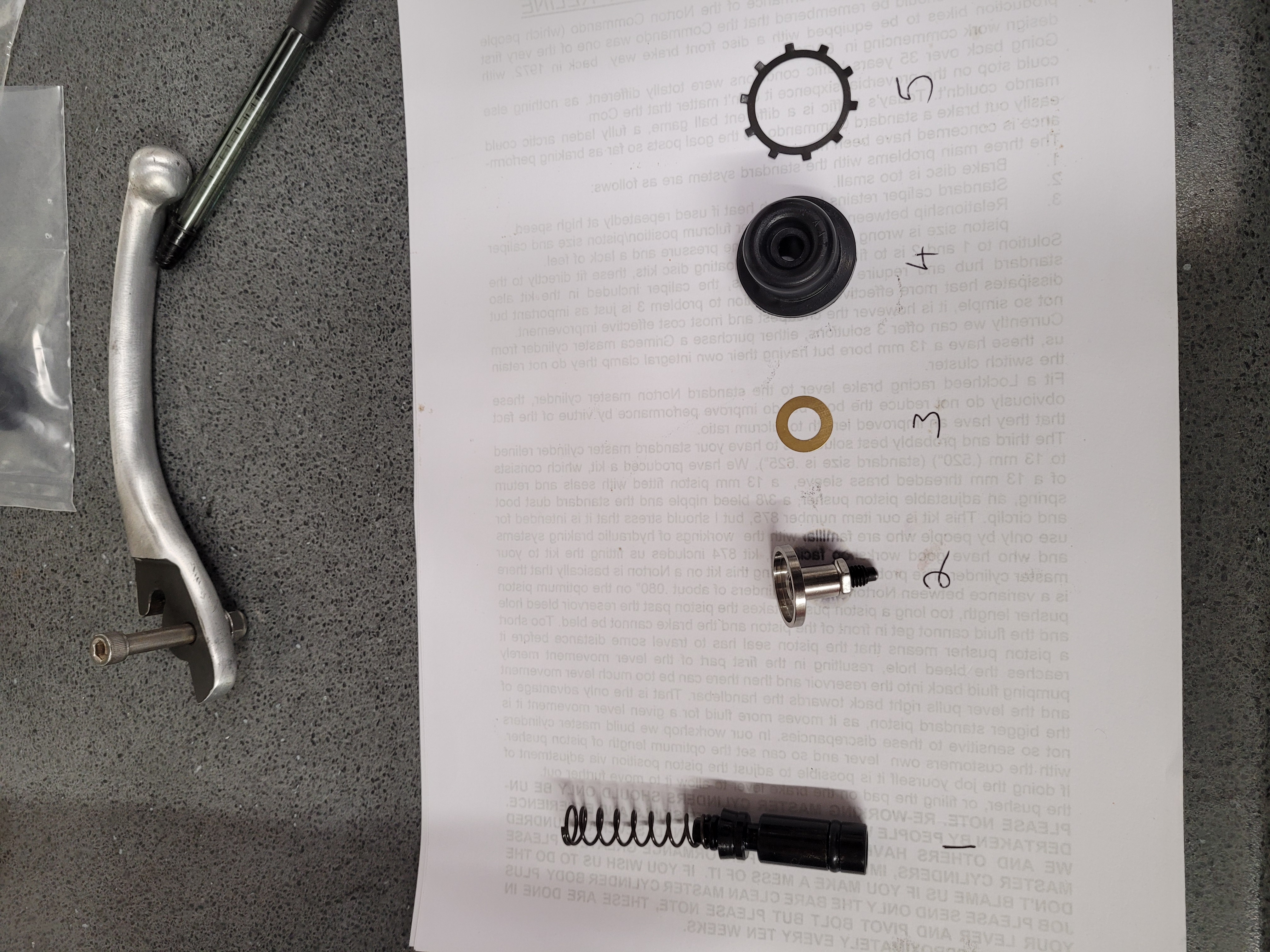 I have drilled & tapped the master cylinder and fitted the sleave without an issue, but can't figure out the correct assembly order for the piston parts. I have attached a photo of the parts and numbered them.