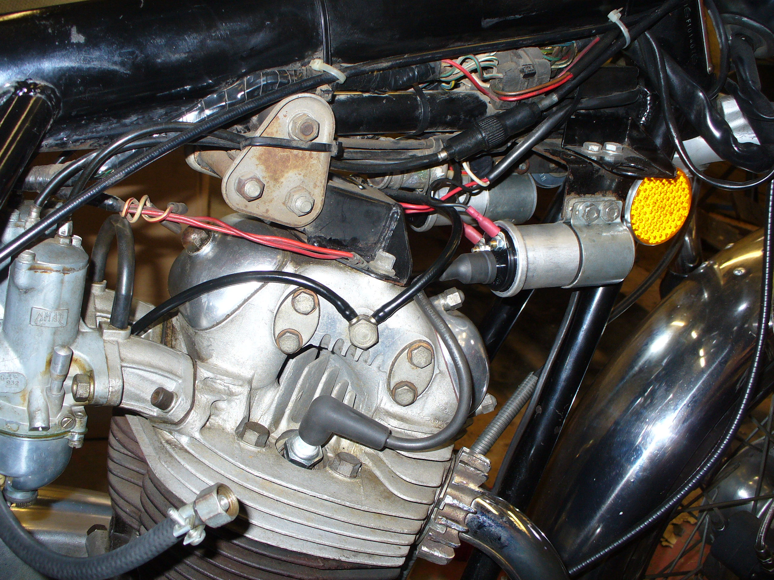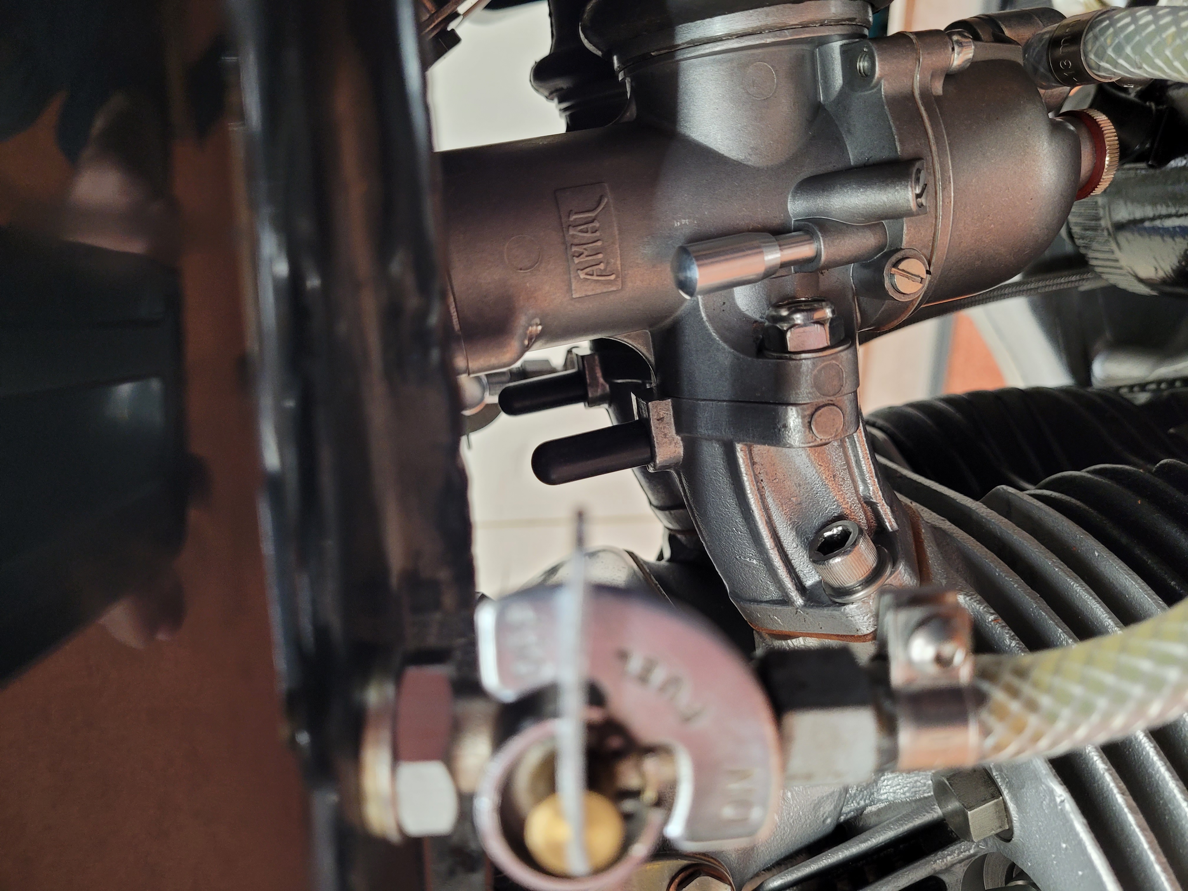 It fired up on the electric starter nicely with a few coughs and splutters, but one of the plugs on the carb manifolds blew off! They are a tight fit, so wasn't expecting that. See photo.